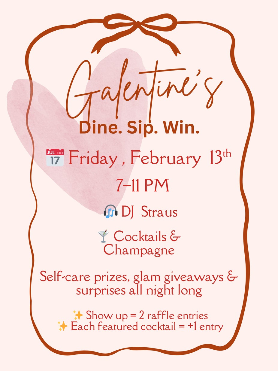 Galentine’s Night at SupperClub is bringing the cocktails, the DJ, and the prizes. Wondering how to win? ✨ Show up = 2 raffle entries 🍸 Each featured cocktail = another chance to win 🎁 Prizes drawn throughout the night (yes, including a Botox gift card) Sip, dance, and let the good stuff come to you 💖 📍 Feb 13 | 7–11 PM
